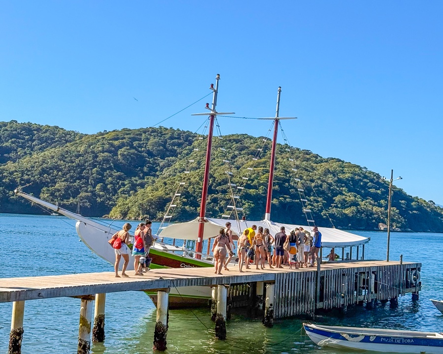 O passeio de escuna percorre alguns dos pontos mais famosos de Ilha Grande, com paradas para banho e contemplação.